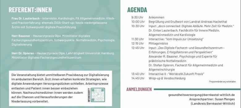 Ziel ist es, die medizinische Versorgung in der Region durch Vernetzung und Synergien zu stärken. Austausch, Workshops und Fachvorträge stehen im Mittelpunkt. Die Referentinnen und Referenten Dr. Enise Lauterbach, Alexander R. Baasner und Dr. Stefan Spieren geben praxisnahe Einblicke, wie eine klassische Praxis erfolgreich in die digitale Welt transformiert werden kann. Für die beiden Fachvorträge können Fortbildungspunkte erworben werden. Die Veranstaltungsreihe „Heimspiel+“ bietet zudem die Möglichkeit zum Austausch und zur Vernetzung zwischen erfahrenen und angehenden Medizinerinnen und Medizinern.Projektskizze Gesundheit MitEINANDER Zukunft: