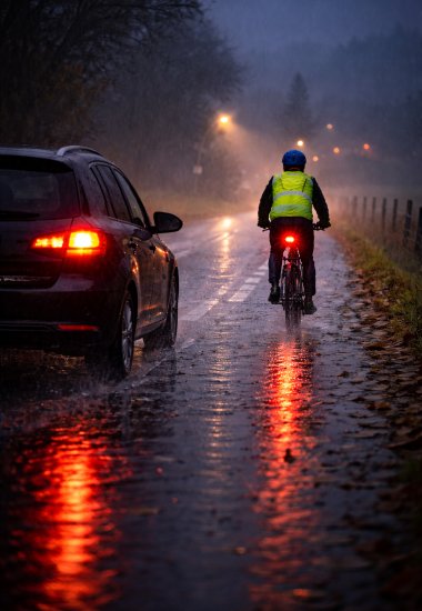 © KI-generiert- Schalten Sie das Licht frühzeitig ein. Auch schon bei Dämmerung oder schlechten Sichtverhältnissen am Tag kann dies zu Ihrer Sicherheit beitragen.