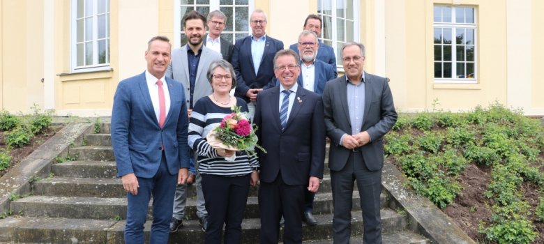 1. Reihe: Bürgermeister Joachim Rodenkirch, Maria und Joachim Schiffer, Landrat Gregor Eibes. 2. Reihe: Ortsvorsteher Klein, Ernst Schmitt, Stephan von St. Vith, Norbert Sartoris, Karl-Josef Schiffer