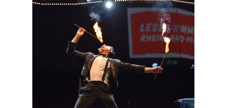 Als nächster Höhepunkt be-trat der Pinguin-Mann Klirr de Luxe die Bühne. Mit einer rasanten Show aus Zauberei, Jonglage und Feuer-Artistik begeisterte er Groß und Klein. Auch eine junge Assistentin durfte auf die Bühne, um gemeinsam mit ihm die Zuschauer zu verzaubern.