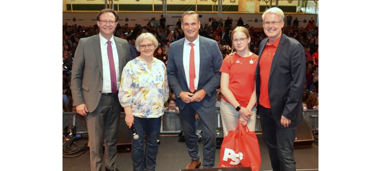 Landrat Andreas Hackethal, Bürgermeister Joachim Rodenkirch und der Vorstand der Sparkasse Mittelmosel Eifel-Mosel-Hunsrück Eric Westerheide begrüßten gemeinsam das Publikum und zeigten sich beeindruckt von der großen Lesebegeisterung im Landkreis. Gut 80 Prozent der über 1.000 Teilnehmer hatten mit mindestens drei Büchern erfolgreich abgeschlossen und machten damit den Lesesommer der Stadt- und Kreisergänzungsbücherei Wittlich zum größten im ganzen Land. Herzliche Dankesworte gingen an die Firma Bungert, die sowohl das Festzelt unentgeltlich zur Verfügung stellte als auch Getränke und Gutscheine für die Verlosung stiftete, an die Sparkasse und die Stiftung Stadt Wittlich für die langjährige finanzielle Unterstützung, an das Land Rheinland-Pfalz für die Fördermittel und an die 23 ehrenamtlichen Helferinnen und Helfern, die tausende von Interviews über die gelesenen Bücher führten. Ein besonderes Lob ging außerdem an alle Eltern für unermüdliche Fahrdienste und sonstige Unterstützung. Großer Jubel kam auf, als nach der Begrüßung kleine Plüschhunde von der Bühne aus verteilt wurden.