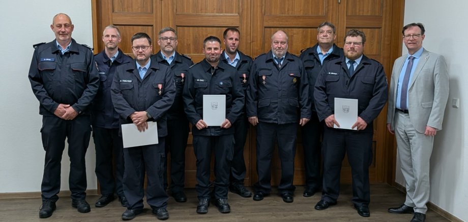 Für ihr außergewöhnlich langjähriges Engagement wurden Jörg Eichhorn, Martin Poth und Olaf Schönhofen geehrt, die die Kreisausbildung der Feuerwehren im Landkreis seit mehr als 30 Jahren unterstützen. Landrat Hackethal würdigte ihren unermüdlichen Einsatz und sprach allen Geehrten seinen Dank aus. Auch der stellvertretende Brand- und Katastrophenschutzinspekteur Stephan Christ schloss sich den Glückwünschen an. Die Bedeutung der Kreisausbildung zeigt sich auch in den Teilnehmerzahlen: Jährlich werden rund 500 Feuerwehrangehörige in verschiedenen Fachbereichen ausgebildet.