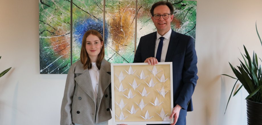 Mit beeindruckendem Engagement und viel Geduld hat die Schülerin Lara Hahn aus Arenrath ein außergewöhnliches Zeichen der Solidarität gesetzt. In mühevoller Handarbeit faltete sie insgesamt 1.000 Origami-Kraniche und sammelte damit Spenden für den guten Zweck. Nun überreichte sie Landrat Andreas Hackethal einen liebevoll gestalteten Bilderrahmen mit einigen der filigranen Papierkunstwerken, der künftig das Foyer des Kreishauses in Wittlich schmücken wird.