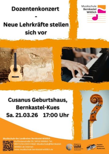 Die Musikschule des Landkreises Bernkastel-Wittlich lädt am Samstag, 21. März 2026, um 17:00 Uhr zu einem besonderen Konzerterlebnis in das Cusanus-Geburtshaus in Bernkastel-Kues ein. Der Eintritt ist frei.